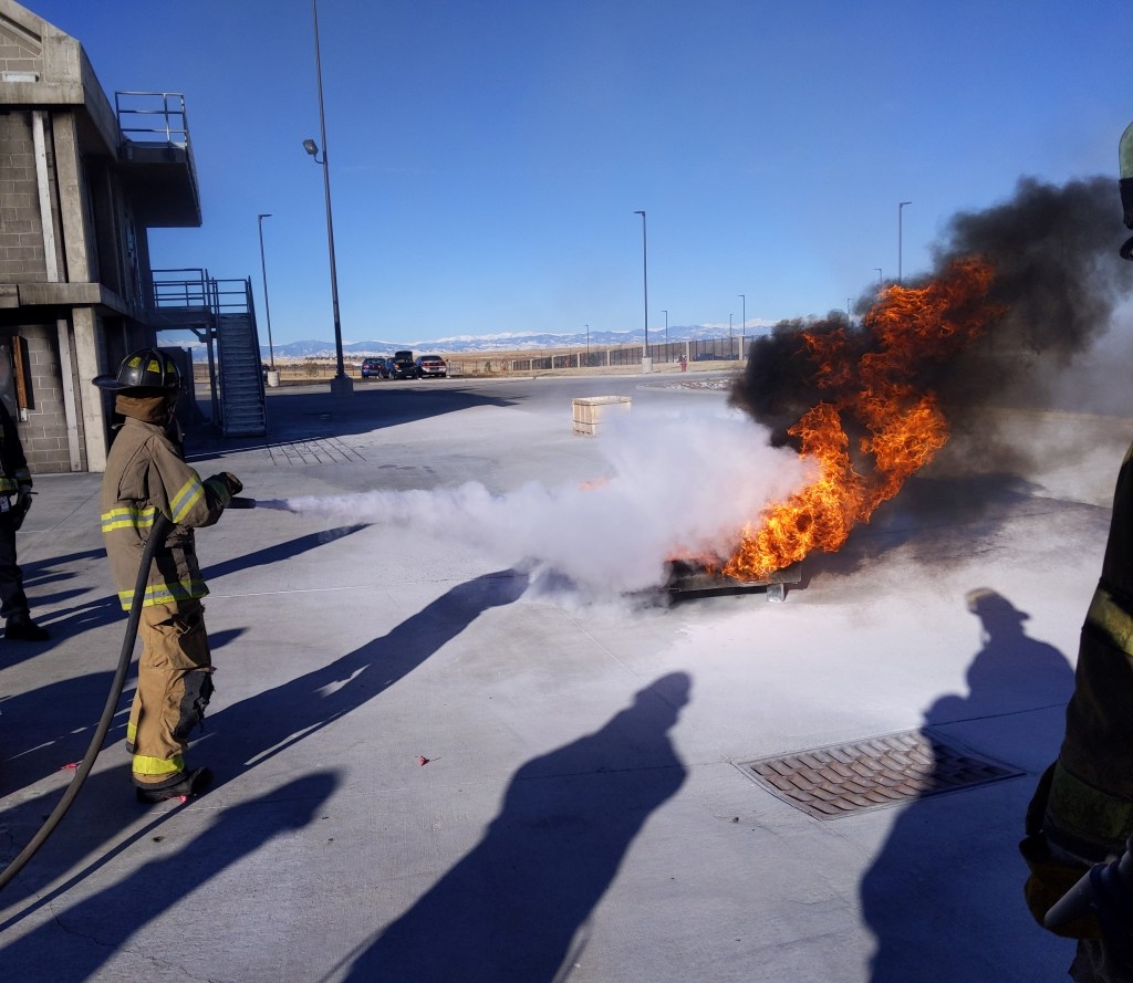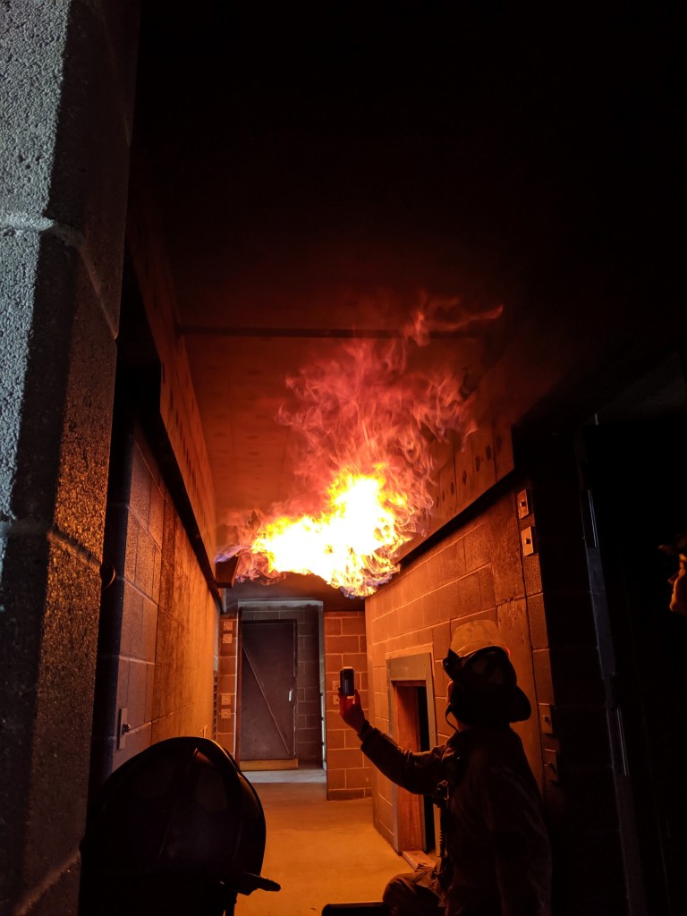 Once we were familiar with that, we went and practiced moving and using the gear. We crawled through a surprisingly small maze with the awkward pack on the back and blindfolds. We also went into a small room to watch a pile of straw and palettes burn. The temperature in that room would likely melt cameras and phones, so I cannot get you a picture.