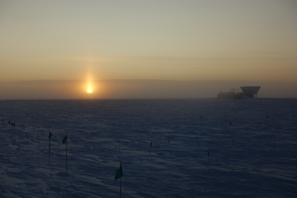 The way we see the sun is complicated by our atmosphere – it isn’t super thick, but it is thick enough to bend the light slightly over the distances we are talking about, so the sun may look like it hasn’t quite set when it actually has. This is further complicated by the “thermal inversion” near the pole, where the air actually gets warmer a few tens of meters above ice level, which changes it’s index of refraction. All of this means that it is easier to see the phenomena known as the “green flash” and, less common “blue flash” – they stick around for longer.
